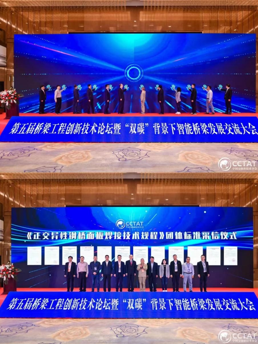 中交第二航务工程局副总经理、总工程师张永涛,中国交通运输协会副会长钟华分别致辞,中国交通运输协会副会长兼秘书长、协会标准化技术委员会主任委员李刚做《正交异性钢桥面板焊接技术规程》标准发布仪式致辞,并向起草单位代表中铁宝桥(扬州)有限公司、苏交科集团股份有限公司、中铁九桥工程有限公司、中建钢构江苏有限公司颁发标准公告和文本。民革中央原副主席修福金为标准起草牵头单位中铁宝桥(扬州)有限公司颁赠他的作品和寄语。